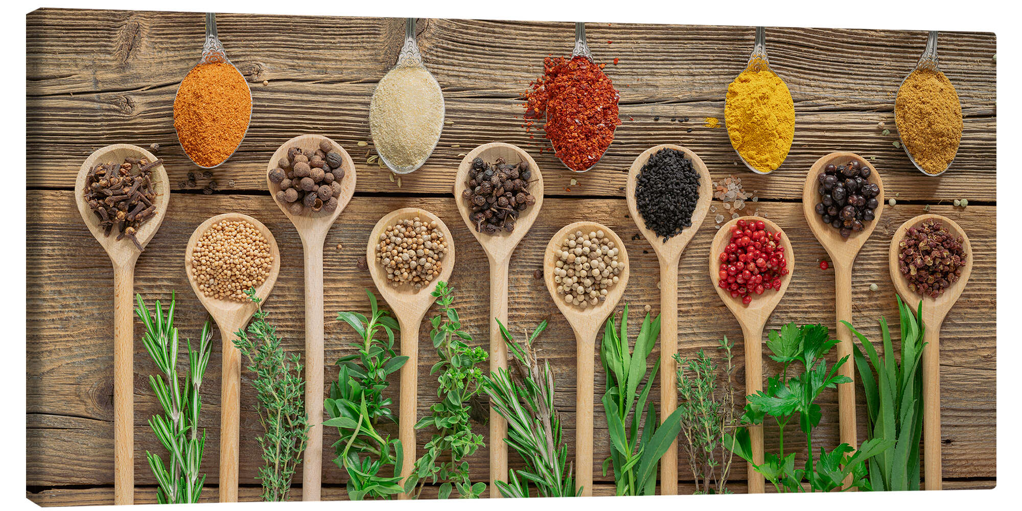 Leinwandbild Exotische Gewürzmischung mit frischen Kräutern