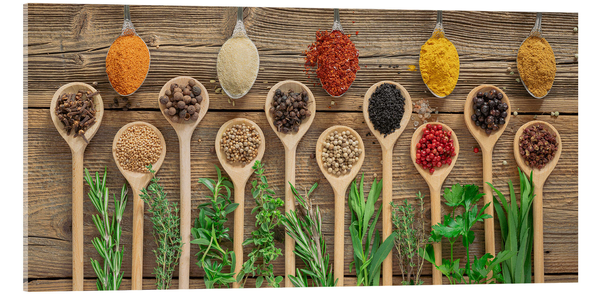Acrylglasbild Exotische Gewürzmischung mit frischen Kräutern