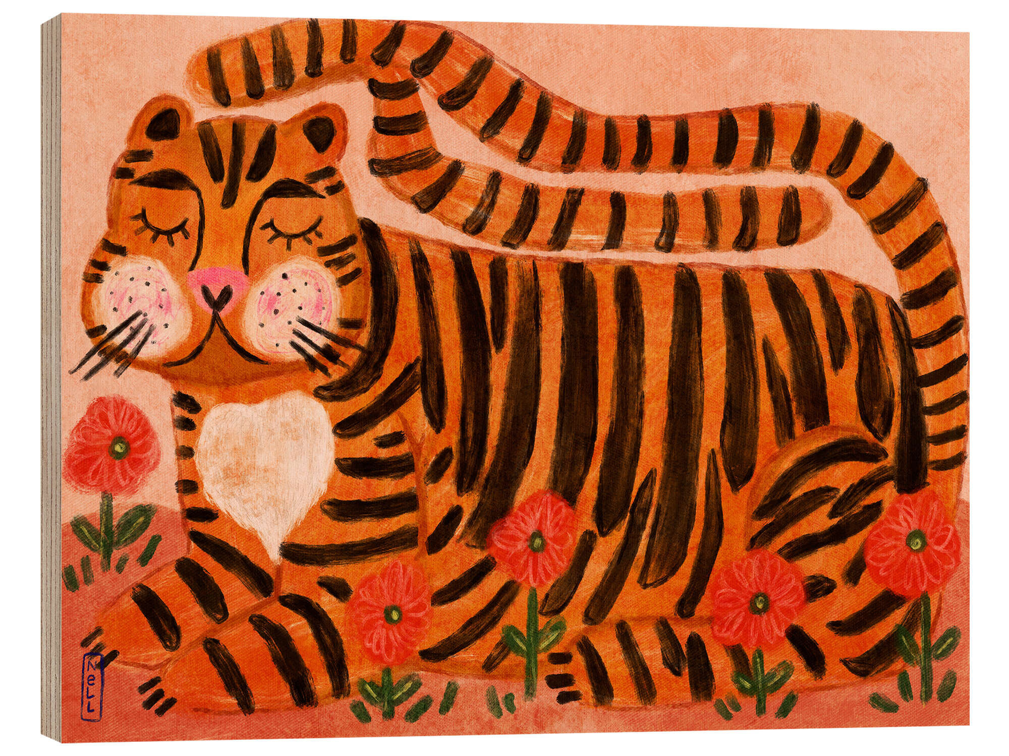 Holzbild Schlafender Tiger im Blumengarten