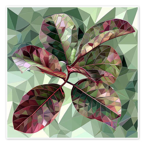 Poster Ficusblätter mit burgunderrotem und grünem Buntglasstil