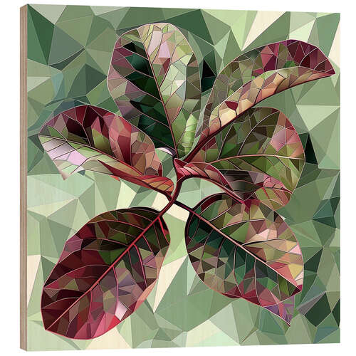 Holzbild Ficusblätter mit burgunderrotem und grünem Buntglasstil