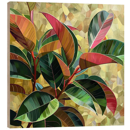 Holzbild Ficus Elastica Kunstwerk in Burgunder- und Goldtöne