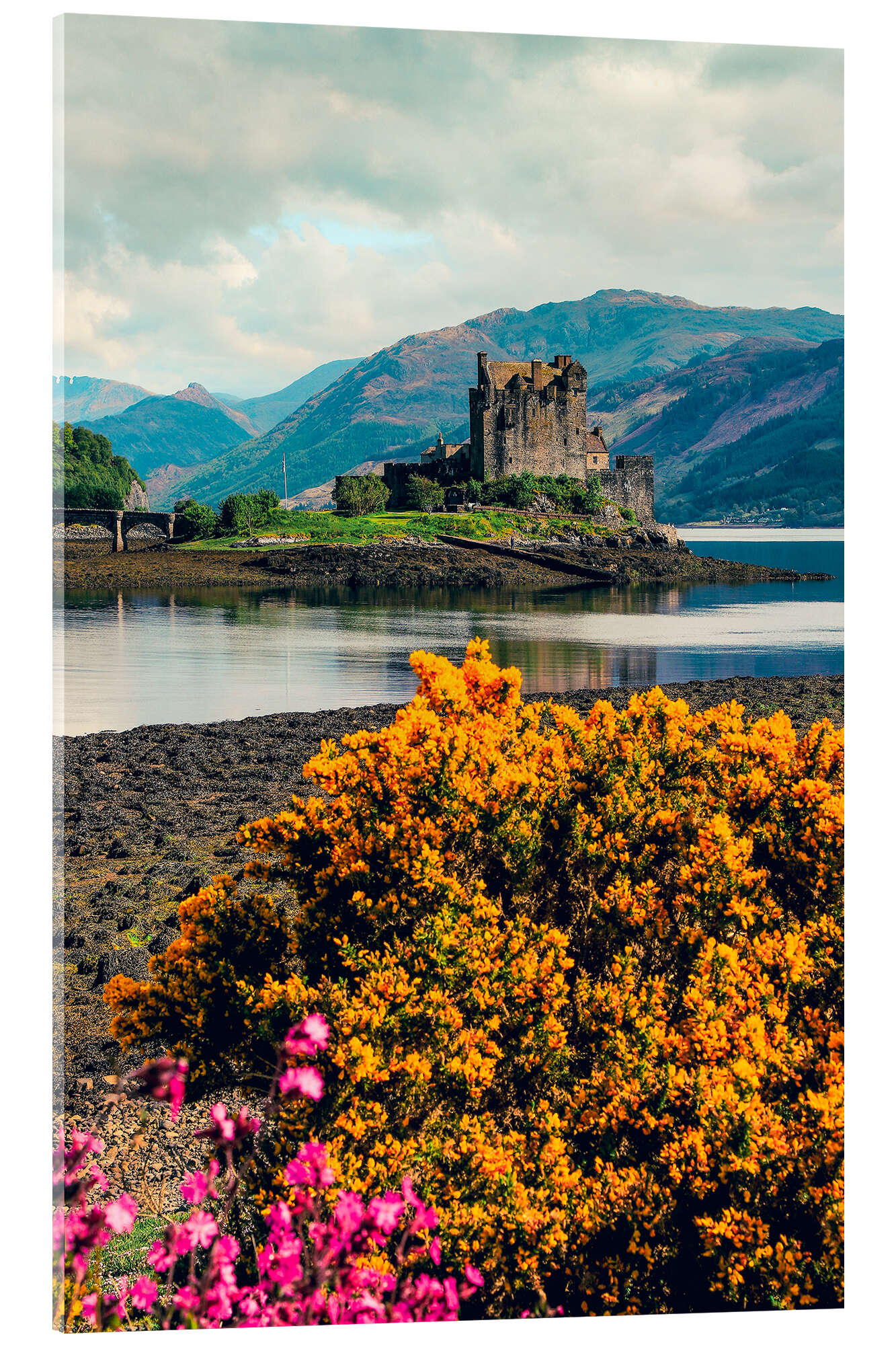 Acrylglasbild Frühlingsblumen und das Eilean Donan Castle, Schottland