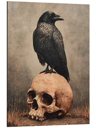 Alubild Halloween-Rabe auf einem menschlichen Schädel
