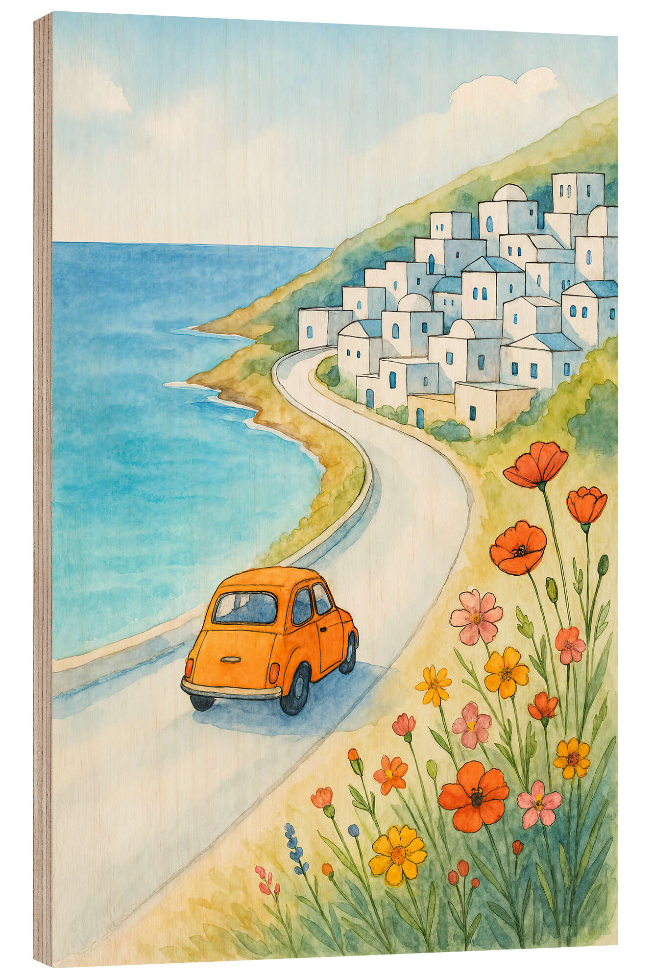 Posterlounge   Wandbilder   Fahrzeuge   Autos   Natalie Bruns   Holzbild Sommer-Roadtrip am Meer im orangefarbenen Auto