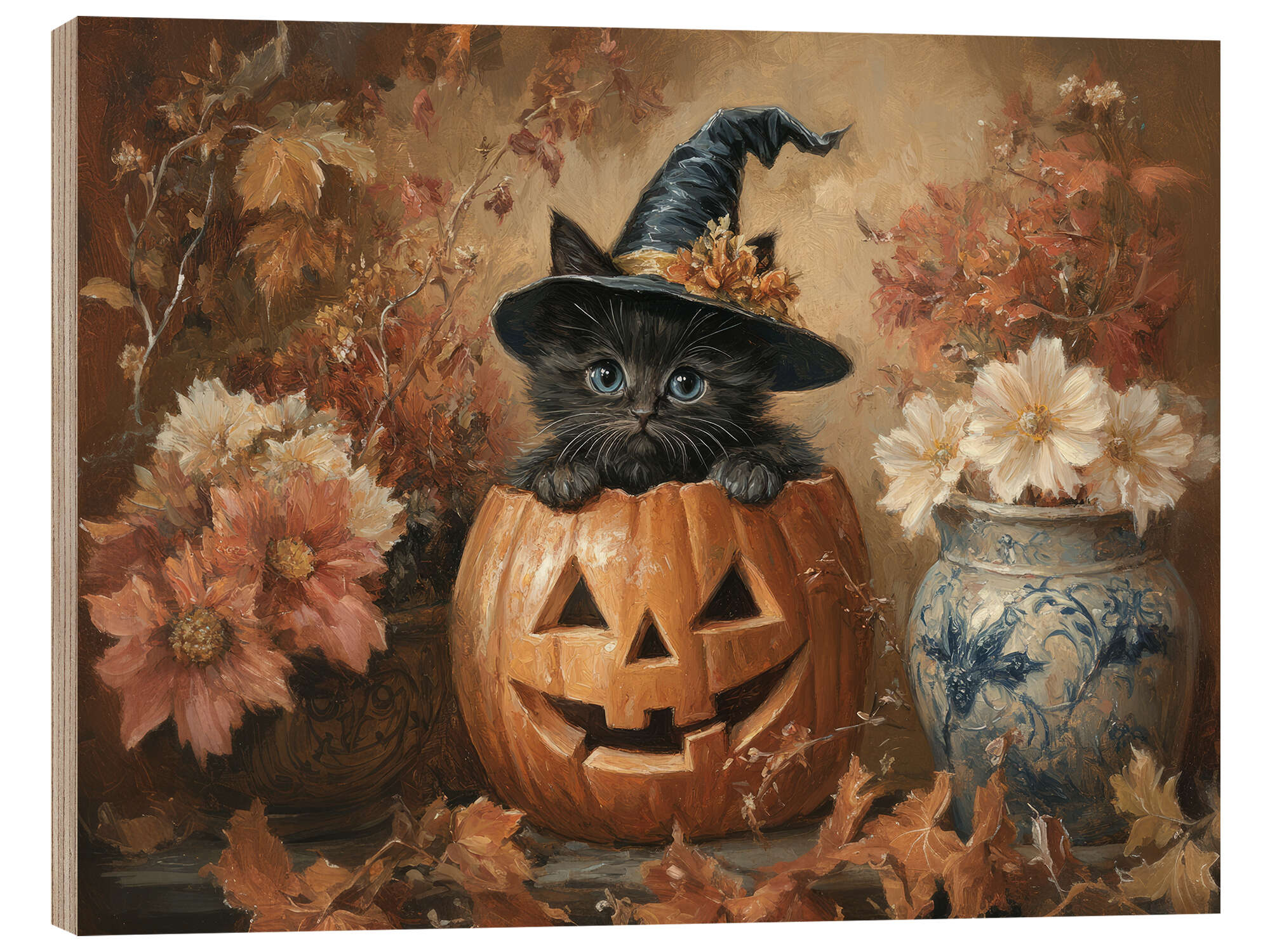 Holzbild Süßes schwarzes Kätzchen und Kürbislaterne