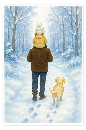 Posterlounge   Wandbilder   Blau   Natalie Bruns   Poster Winterspaziergang mit Papa und Labradorhund