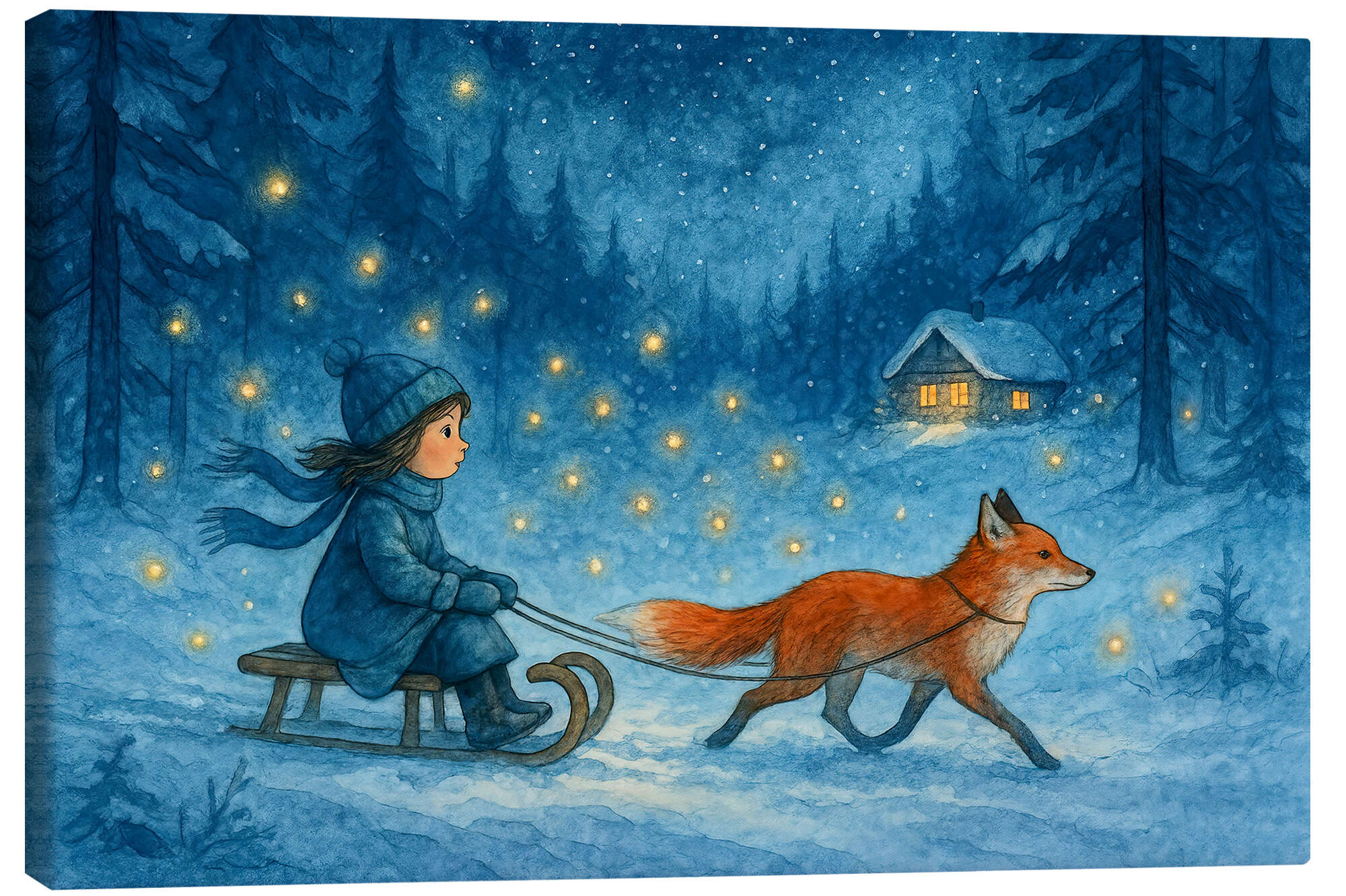 Posterlounge   Wandbilder   Blau   Natalie Bruns   Leinwandbild Mädchen auf Schlitten mit Fuchs und Glühwürmchen