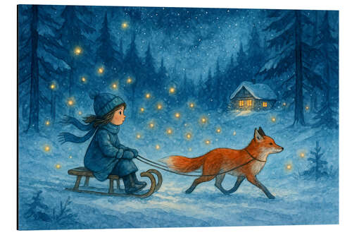 Magnettafel Mädchen auf Schlitten mit Fuchs und Glühwürmchen