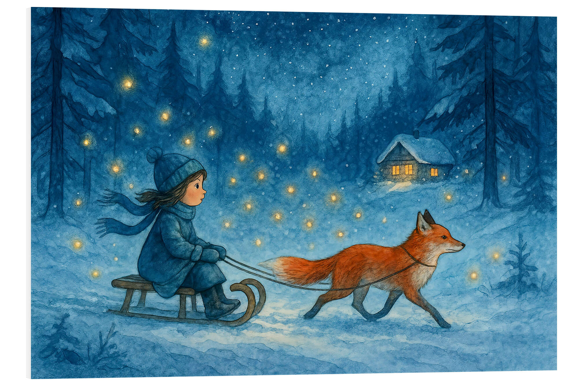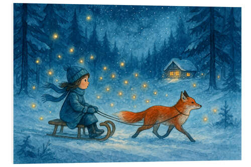 Hartschaumbild Mädchen auf Schlitten mit Fuchs und Glühwürmchen