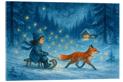 Acrylglasbild Mädchen auf Schlitten mit Fuchs und Glühwürmchen