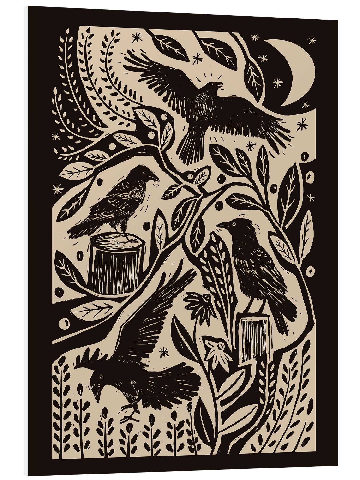 Hartschaumbild Raben im nächtlichen Garten