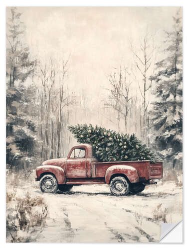 Wandsticker Roter Vintage Truck mit Weihnachtsbaum