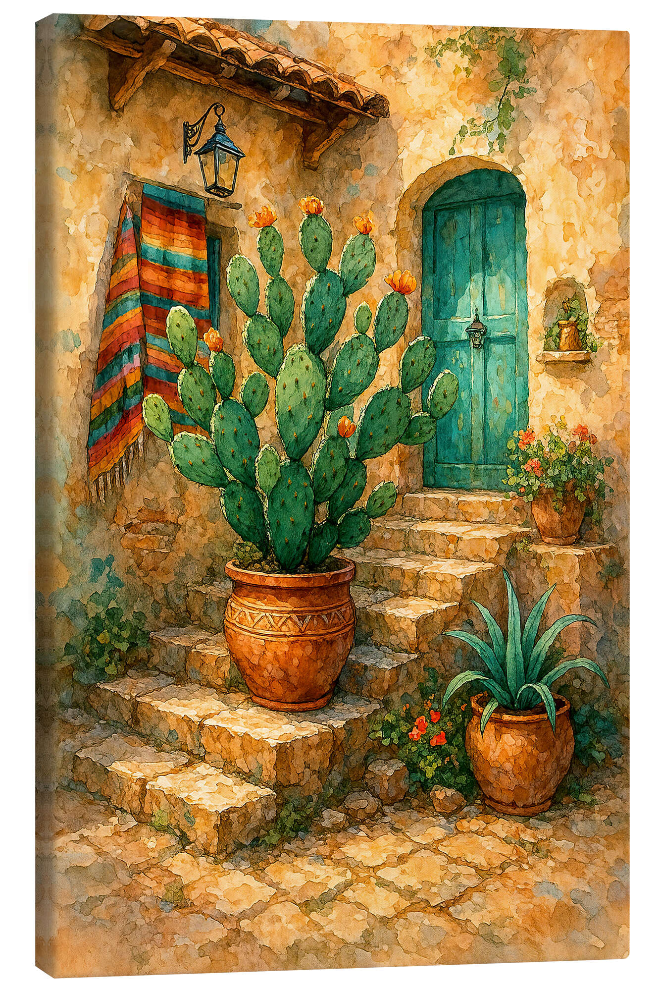 Leinwandbild Sonniges mexikanisches Haus mit blühendem Kaktus
