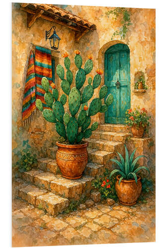 Hartschaumbild Sonniges mexikanisches Haus mit blühendem Kaktus
