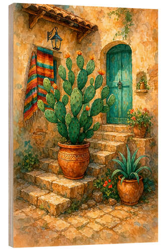 Holzbild Sonniges mexikanisches Haus mit blühendem Kaktus