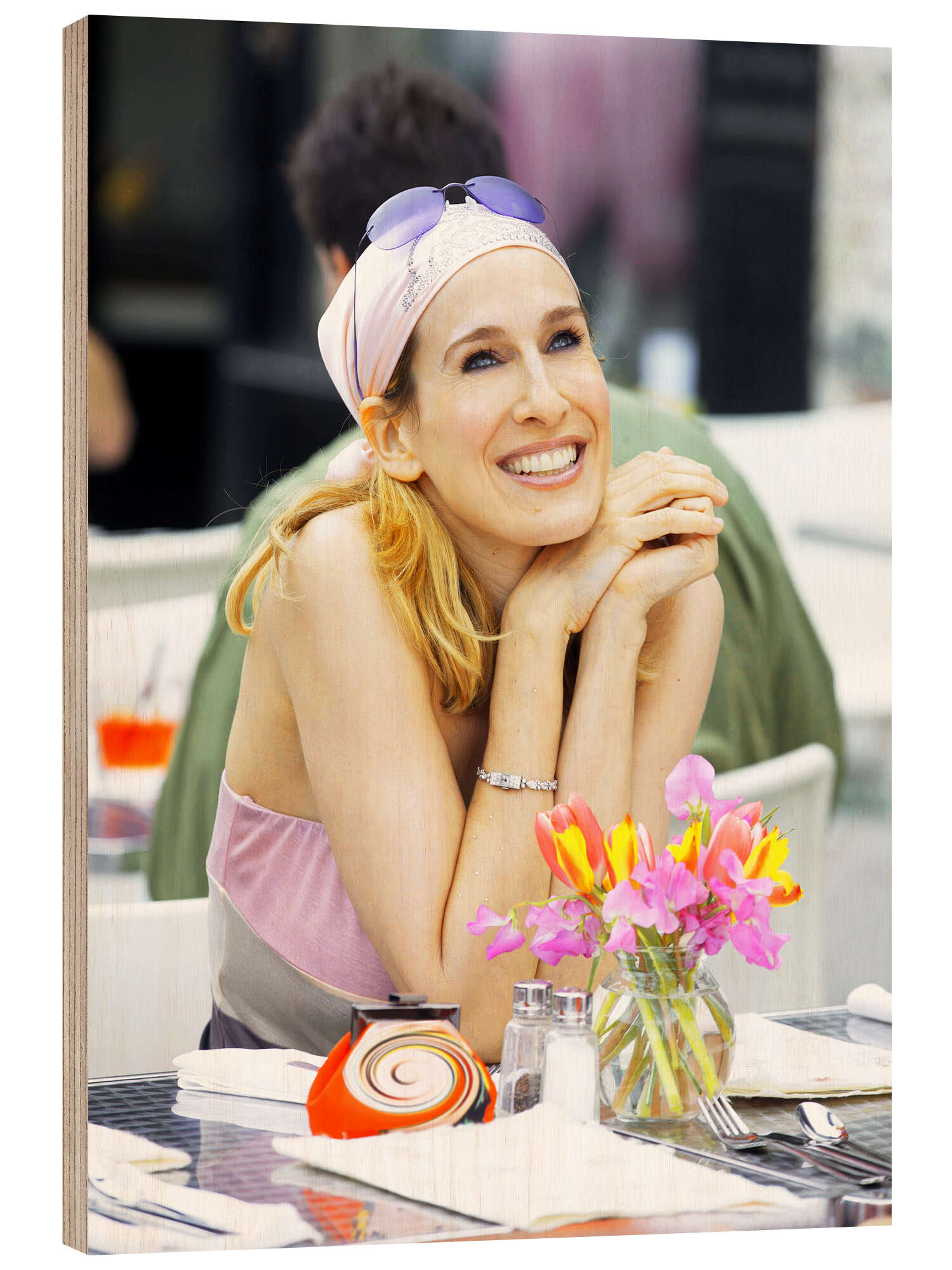 Holzbild Carry Bradshaw mit Bandana und Tulpen