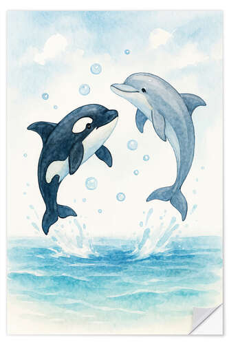 Wandsticker Verspielter Delfin und Orca springen im Meer