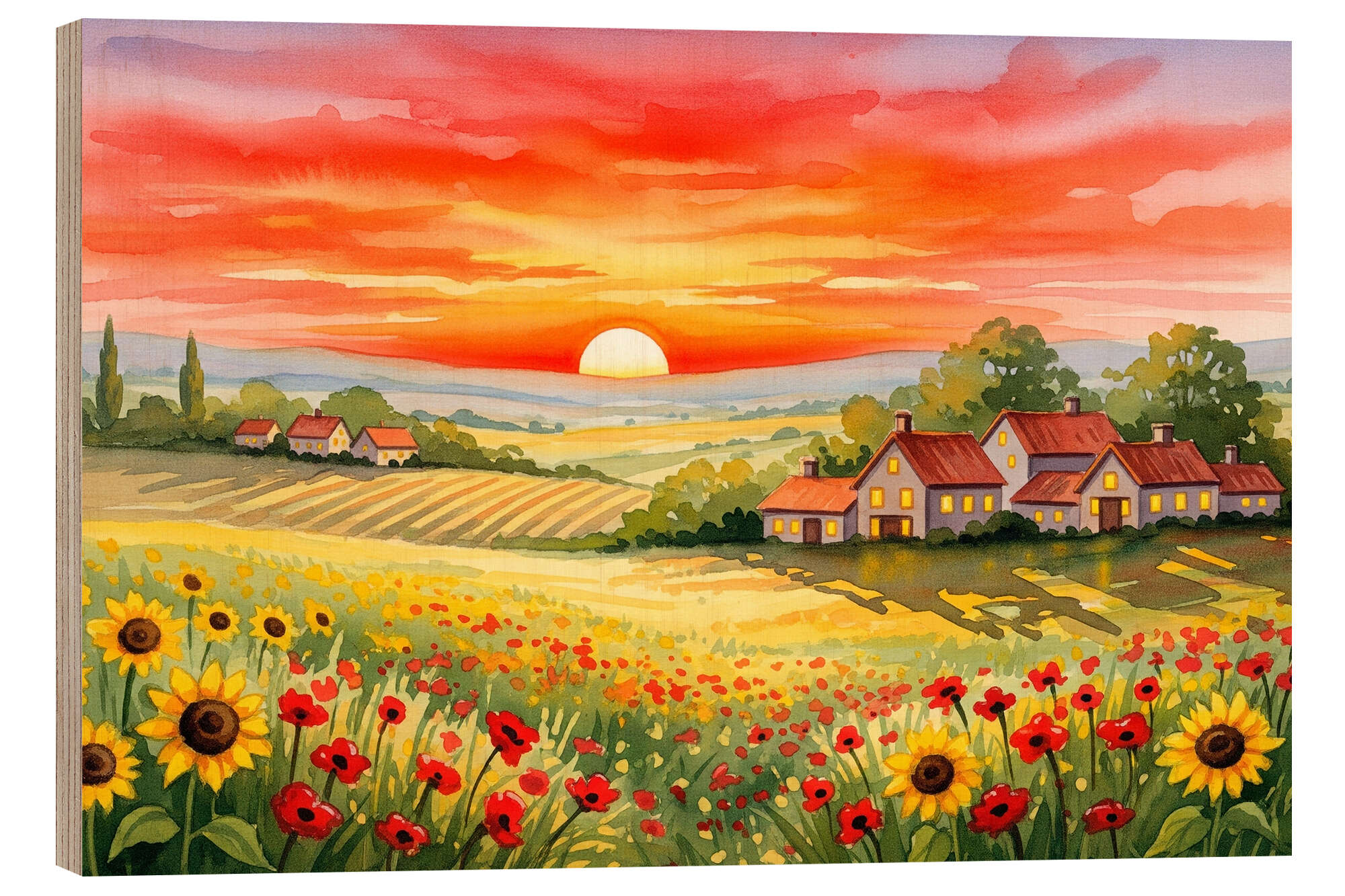 Holzbild Sonnenuntergang auf den Feldern