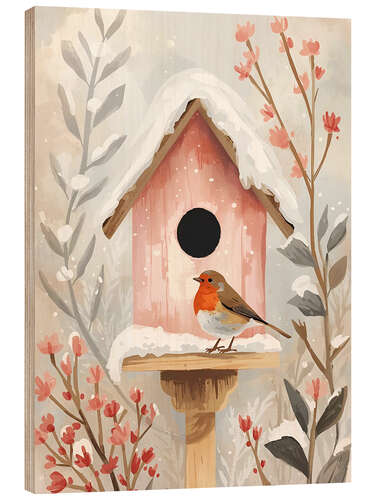 Holzbild Vogelhaus mit Rotkehlchen und Pflanzen