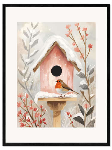 Gerahmter Kunstdruck Vogelhaus mit Rotkehlchen und Pflanzen