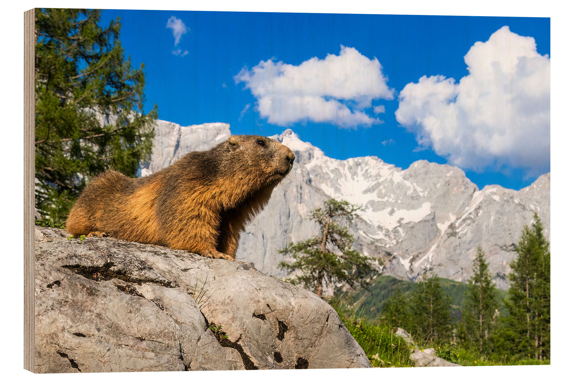 Posterlounge   Wandbilder   Fotografie   Moqui, Daniela Beyer   Holzbild Alpenmurmeltier vor Bergkulisse