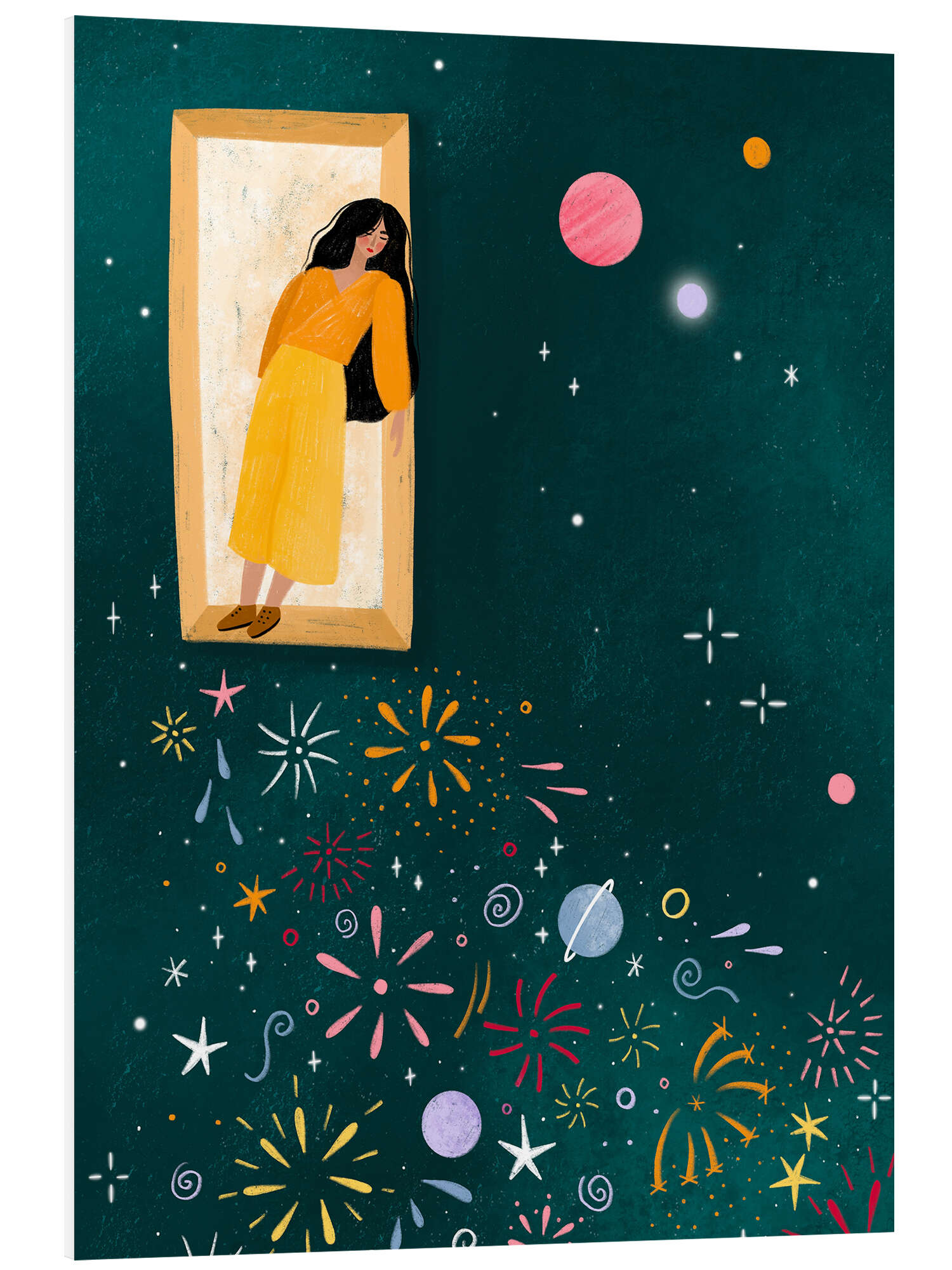 Hartschaumbild Gelbes Kleid lehnt sich aus dem Fenster