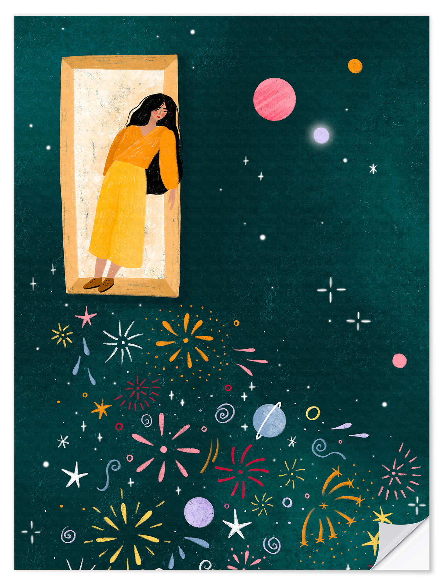 Posterlounge   Wandbilder   Illustration   Bea Müller   Wandsticker Gelbes Kleid lehnt sich aus dem Fenster