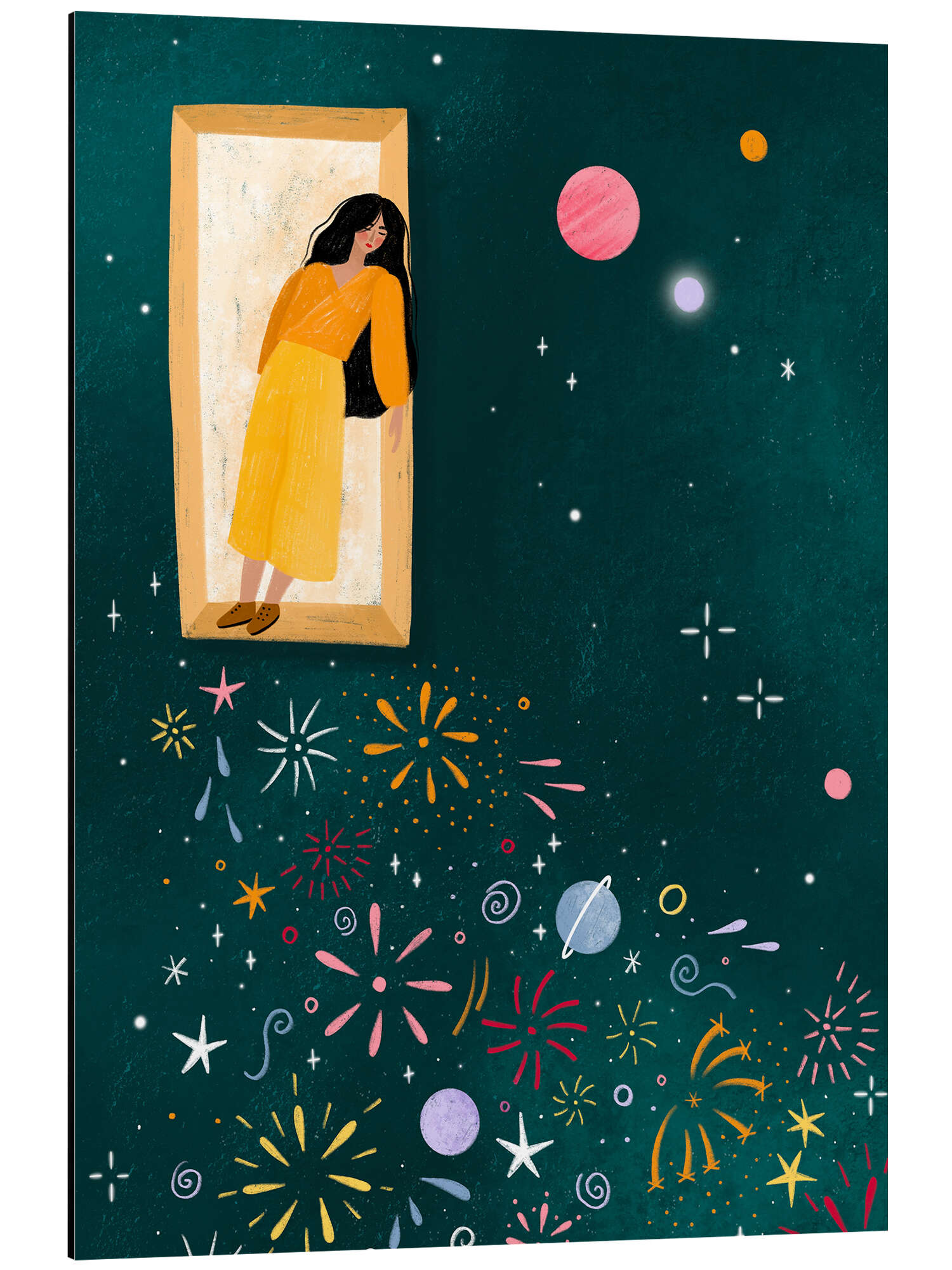 Magnettafel Gelbes Kleid lehnt sich aus dem Fenster