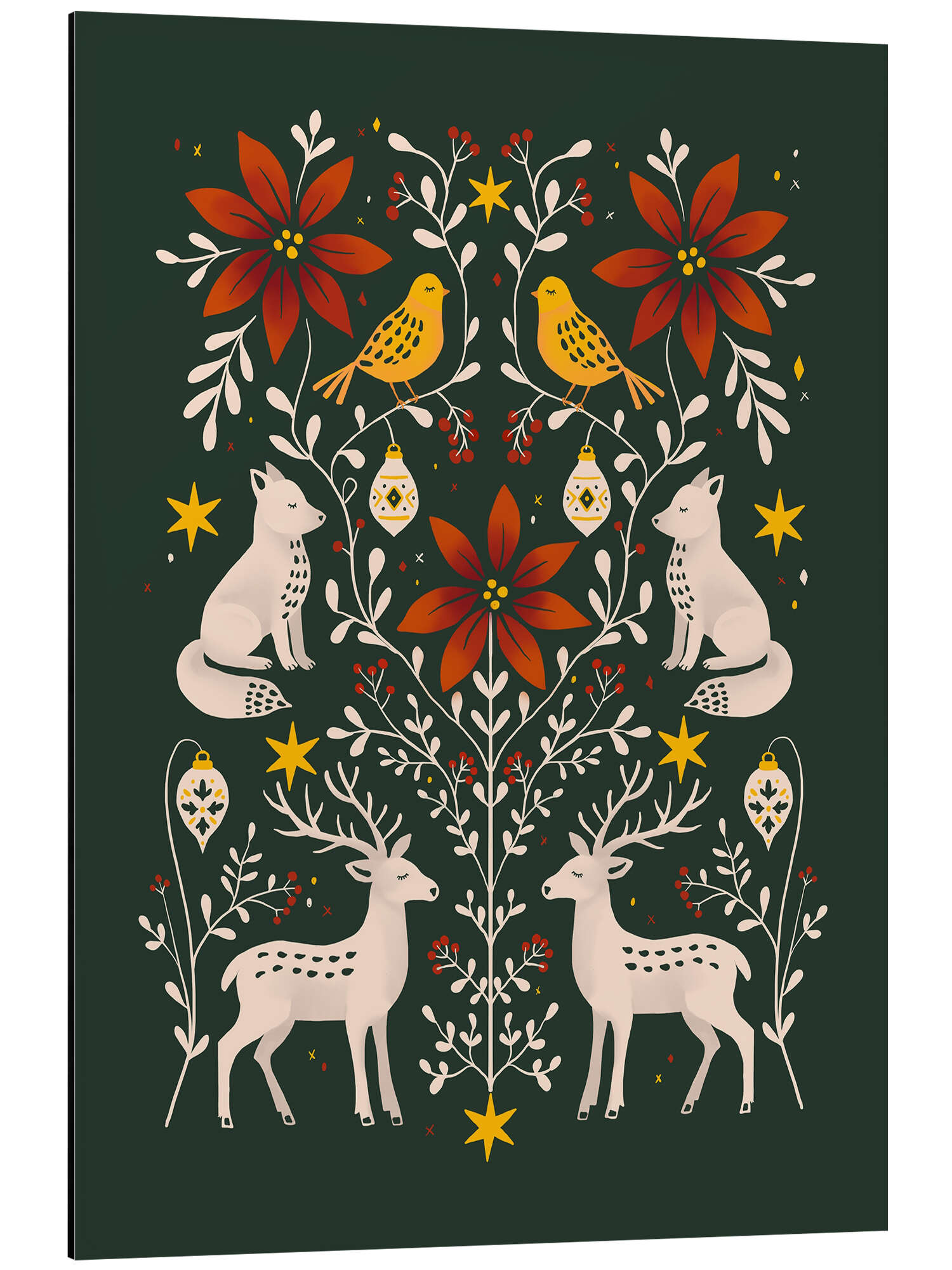 Alubild Waldtiere mit Weihnachtssternen und Zweigen Folk art