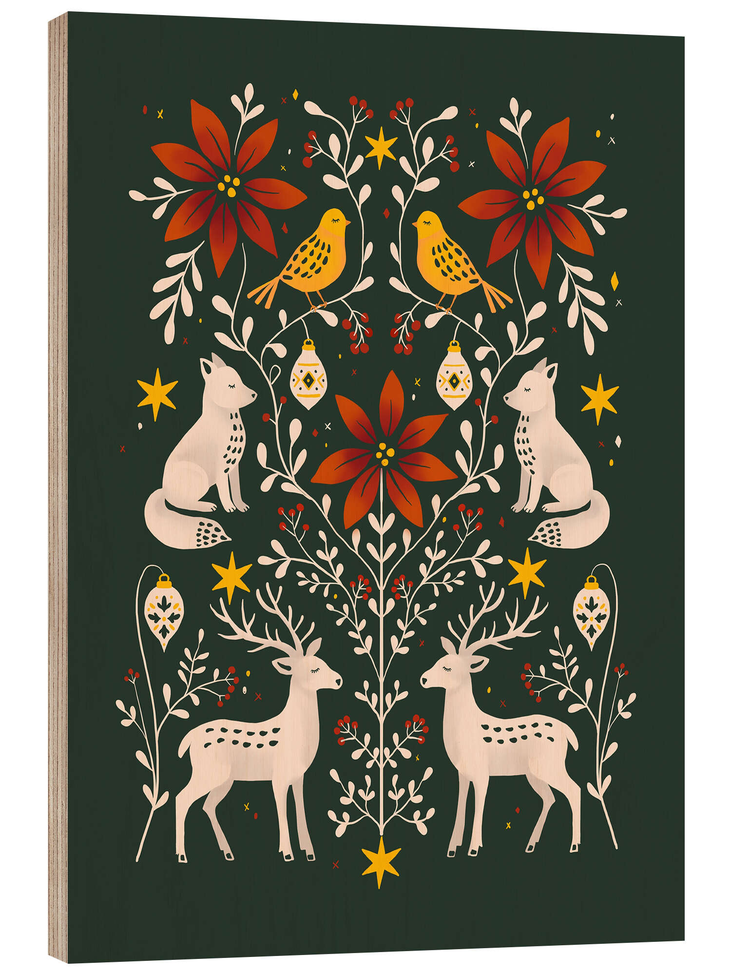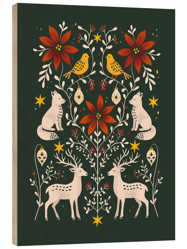 Holzbild Waldtiere mit Weihnachtssternen und Zweigen Folk art