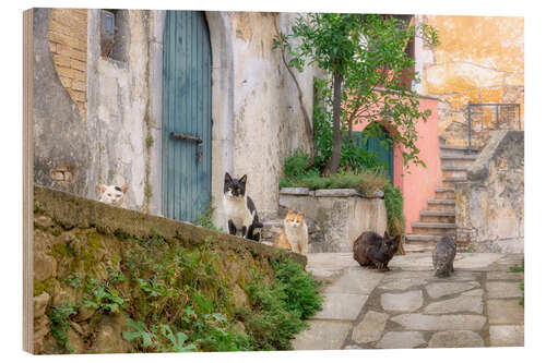 Posterlounge   Wandbilder   Grün   Katho Menden   Holzbild Katzen in einer malerischen Gasse auf Korfu