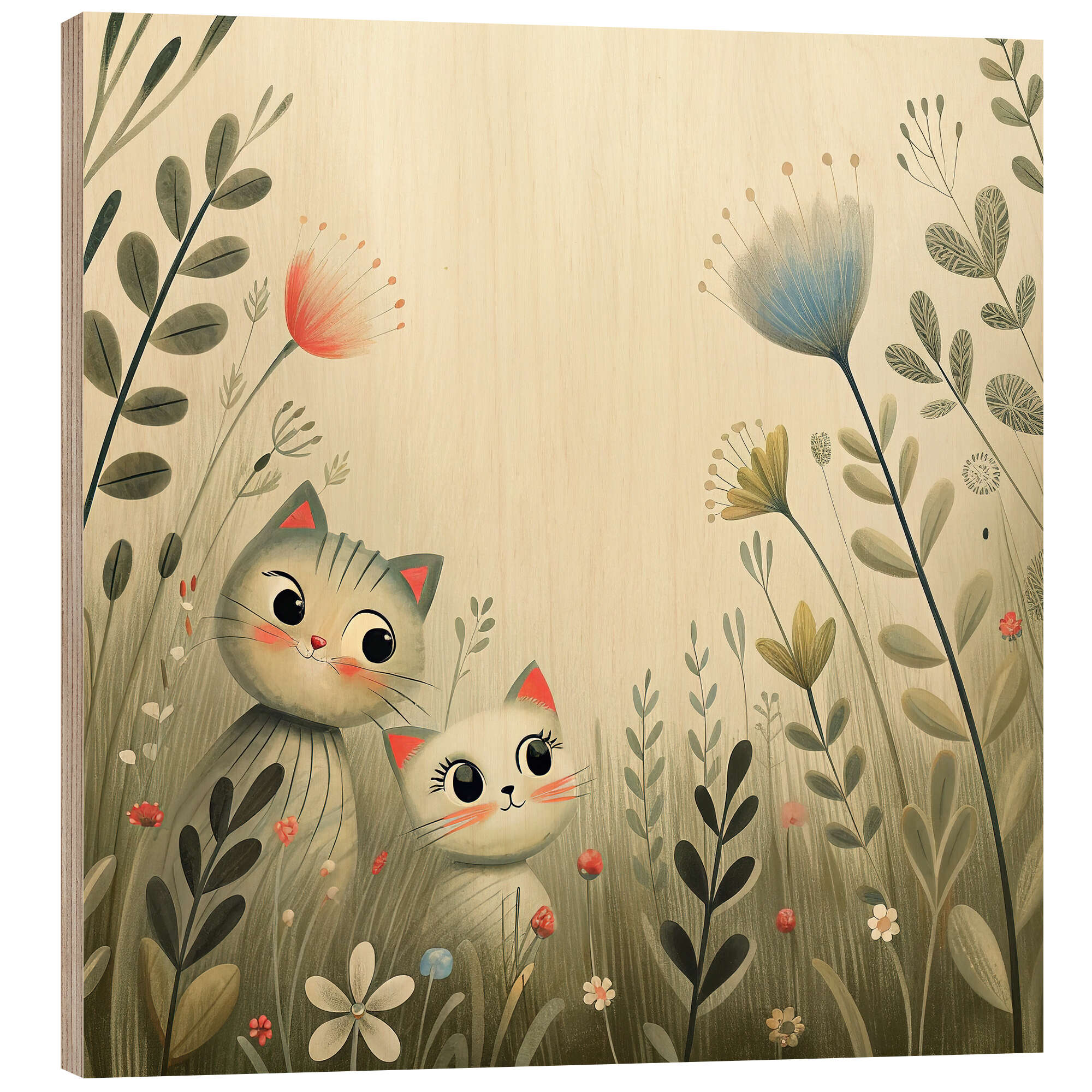 Posterlounge   Wandbilder   Illustration   nobelart   Holzbild Neugierige Kätzchen zwischen Wildblumen