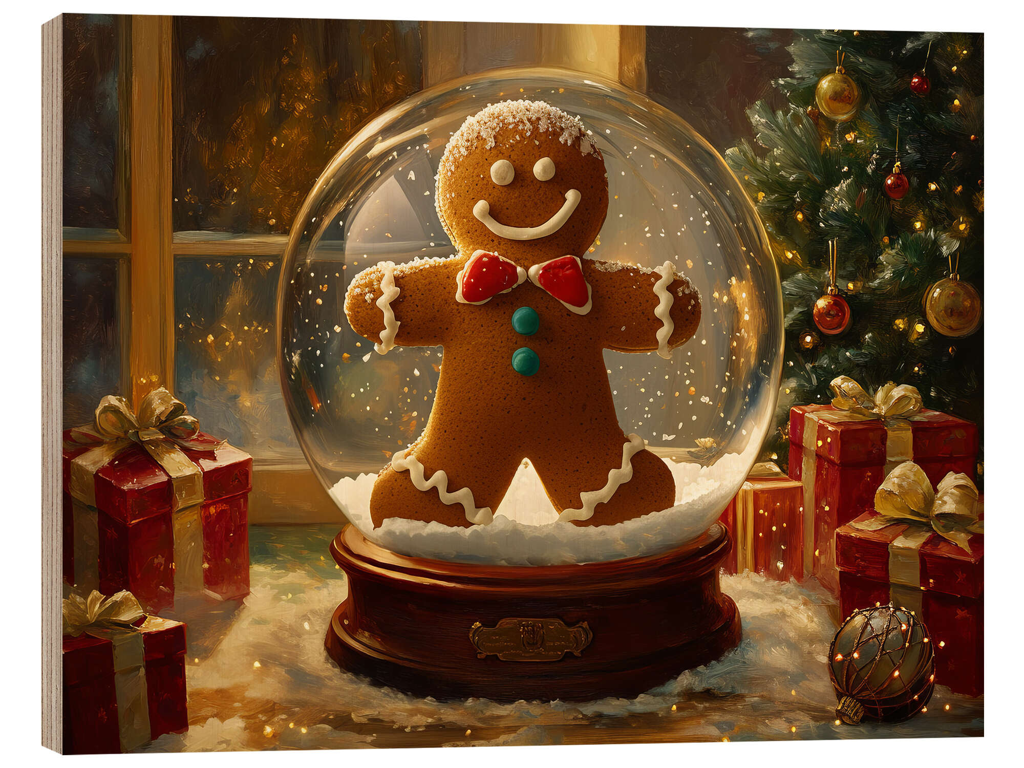 Holzbild Vintage-Weihnachtsschneekugel mit Lebkuchenmotiv