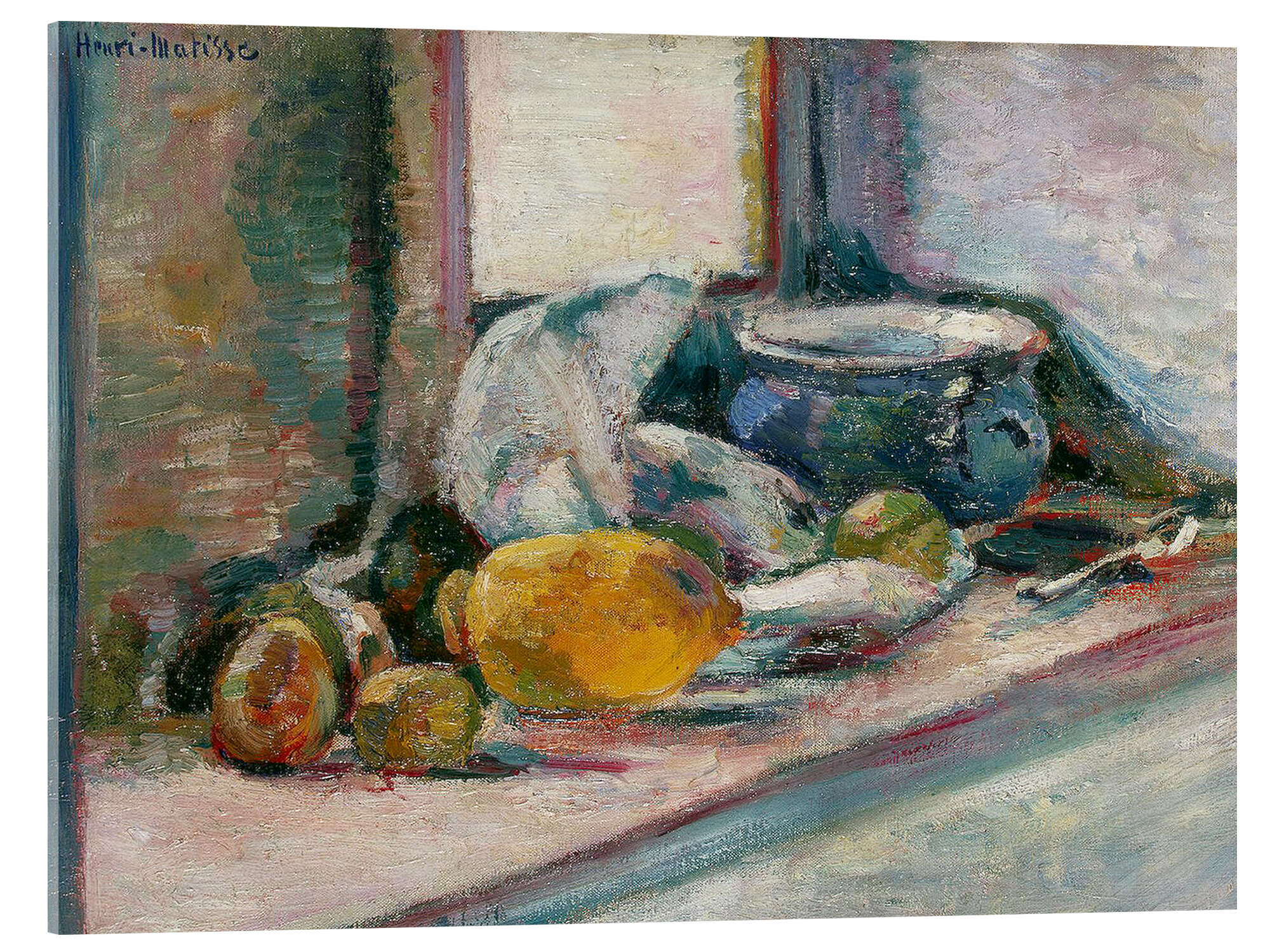 Acrylglasbild Blauer Topf und Zitrone