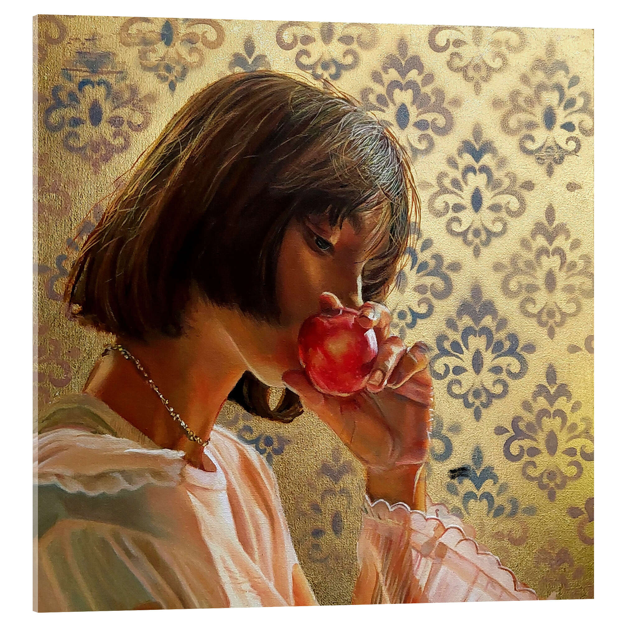 Acrylglasbild Porträt eines Mädchens mit rotem Apfel