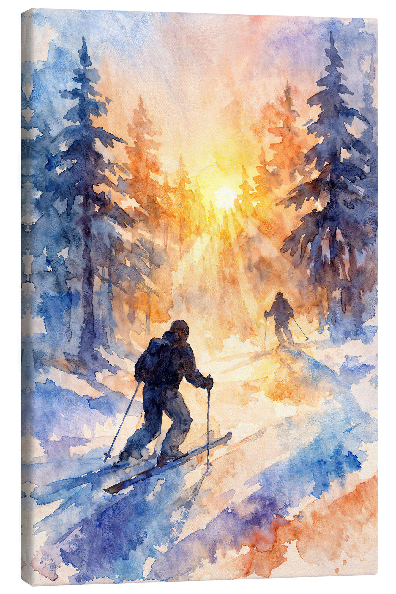 Leinwandbild Skifahrer im verschneiten Wald bei Sonnenaufgang
