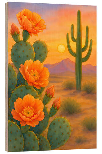 Holzbild Wüstenkaktus mit Orangenblüten im Sonnenuntergang