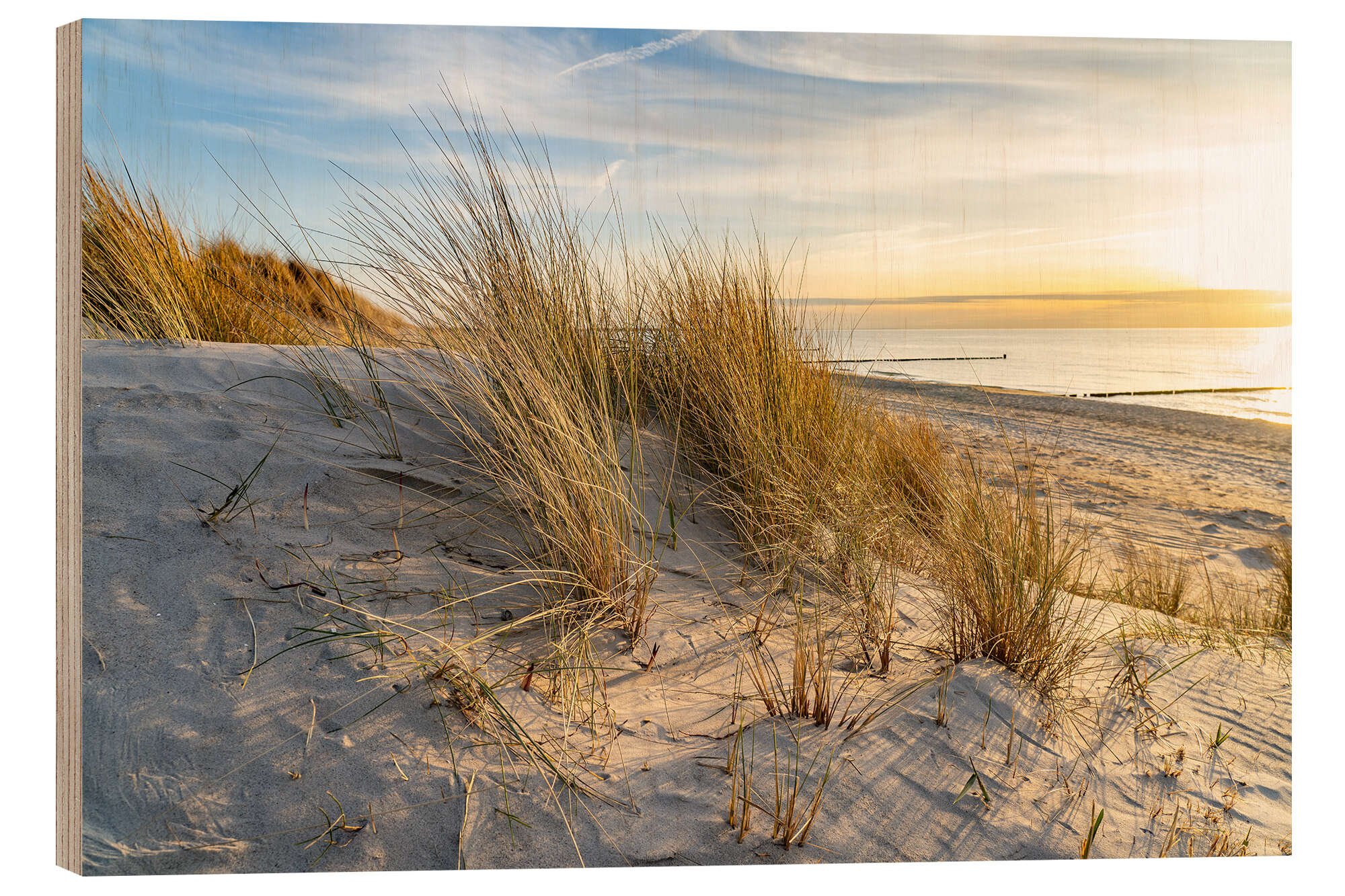 Holzbild Ostsee Strand bei Sonnenuntergang
