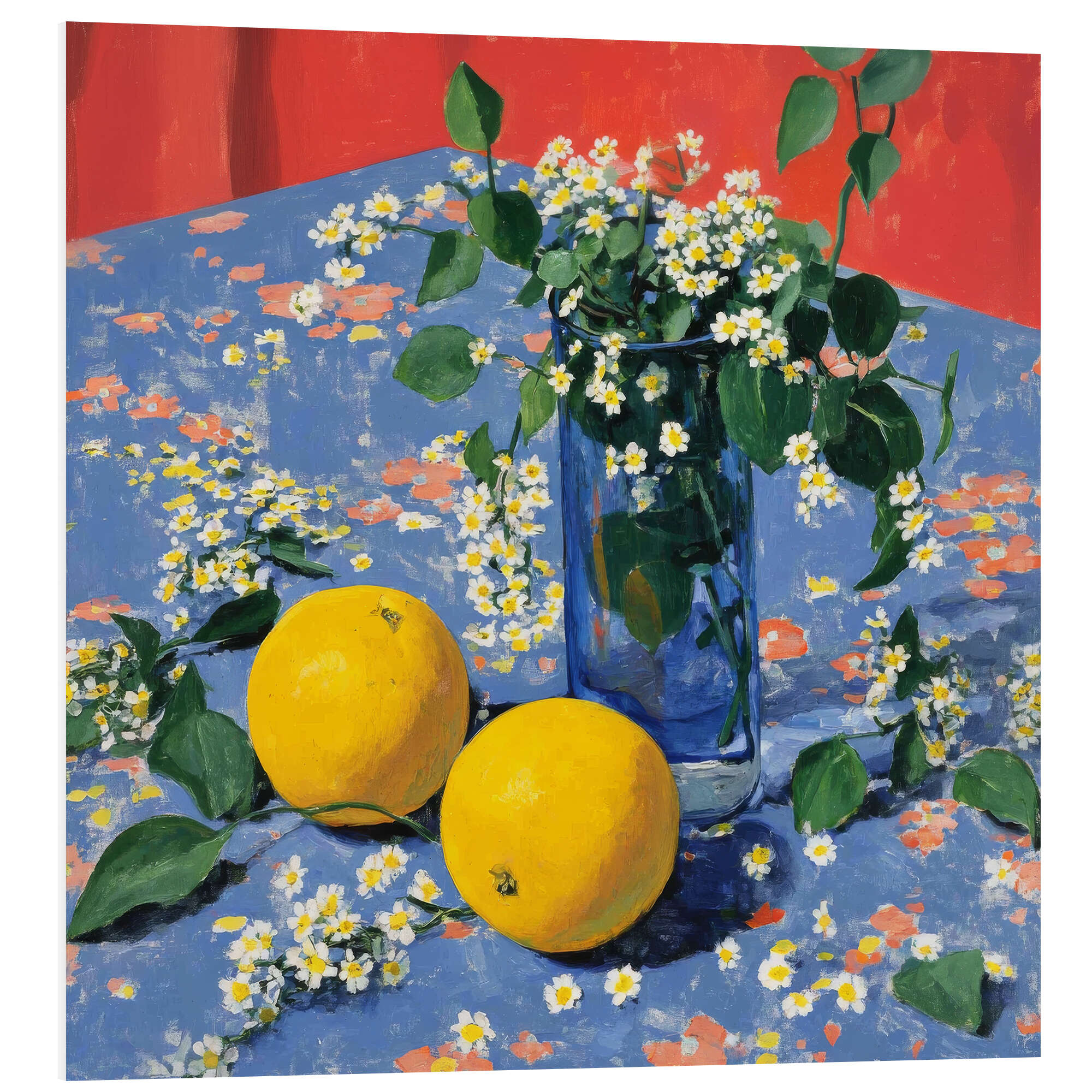 Posterlounge   Wandbilder   Blau   DejaReve   Hartschaumbild Orangen, weiße Blumen und ein Moment der Ruhe