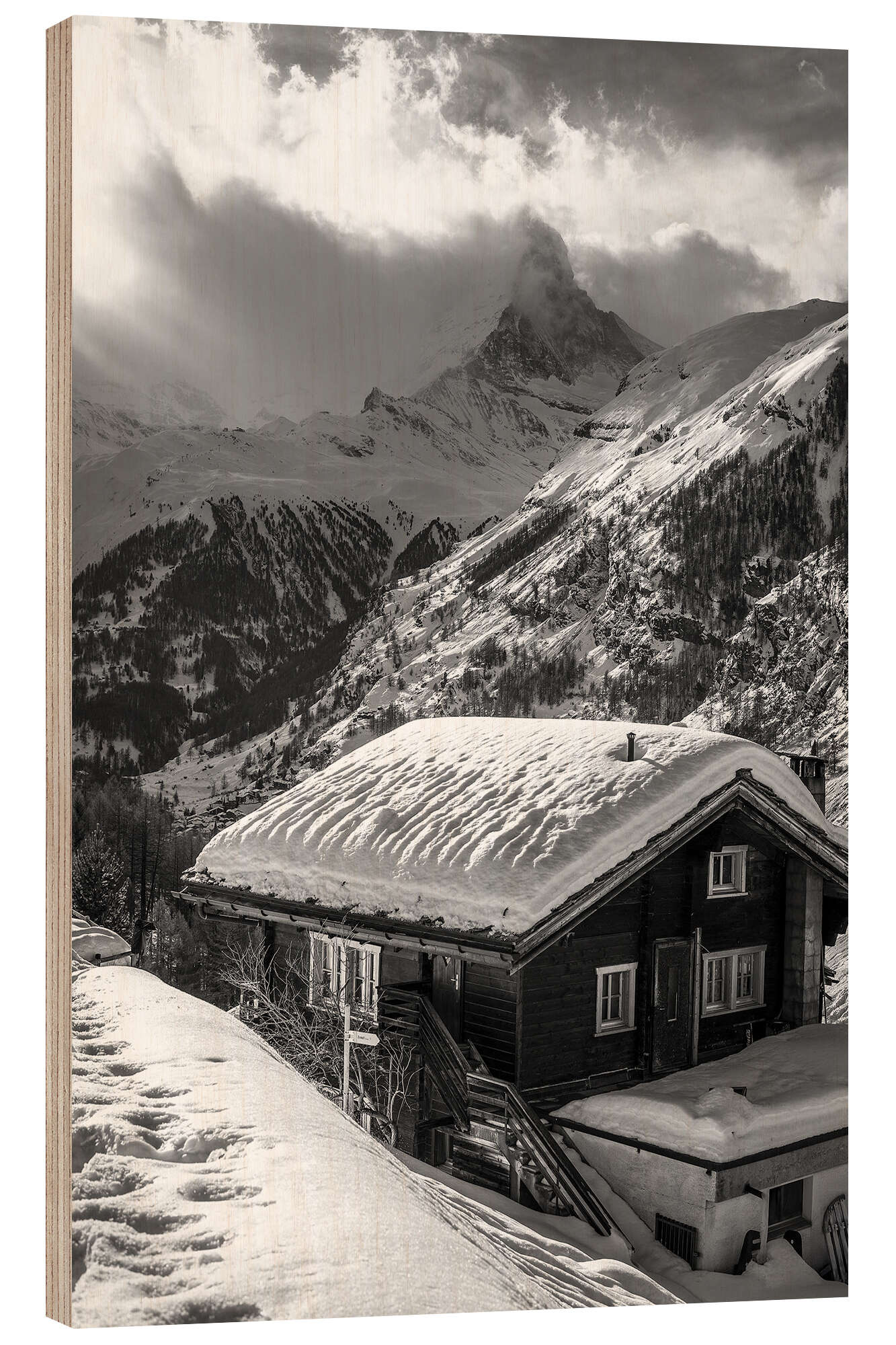 Posterlounge   Wandbilder   Schwarz-Weiß   Christian Müringer   Holzbild Matterhorn mit altem Holzhaus tief verschneit, Schweiz