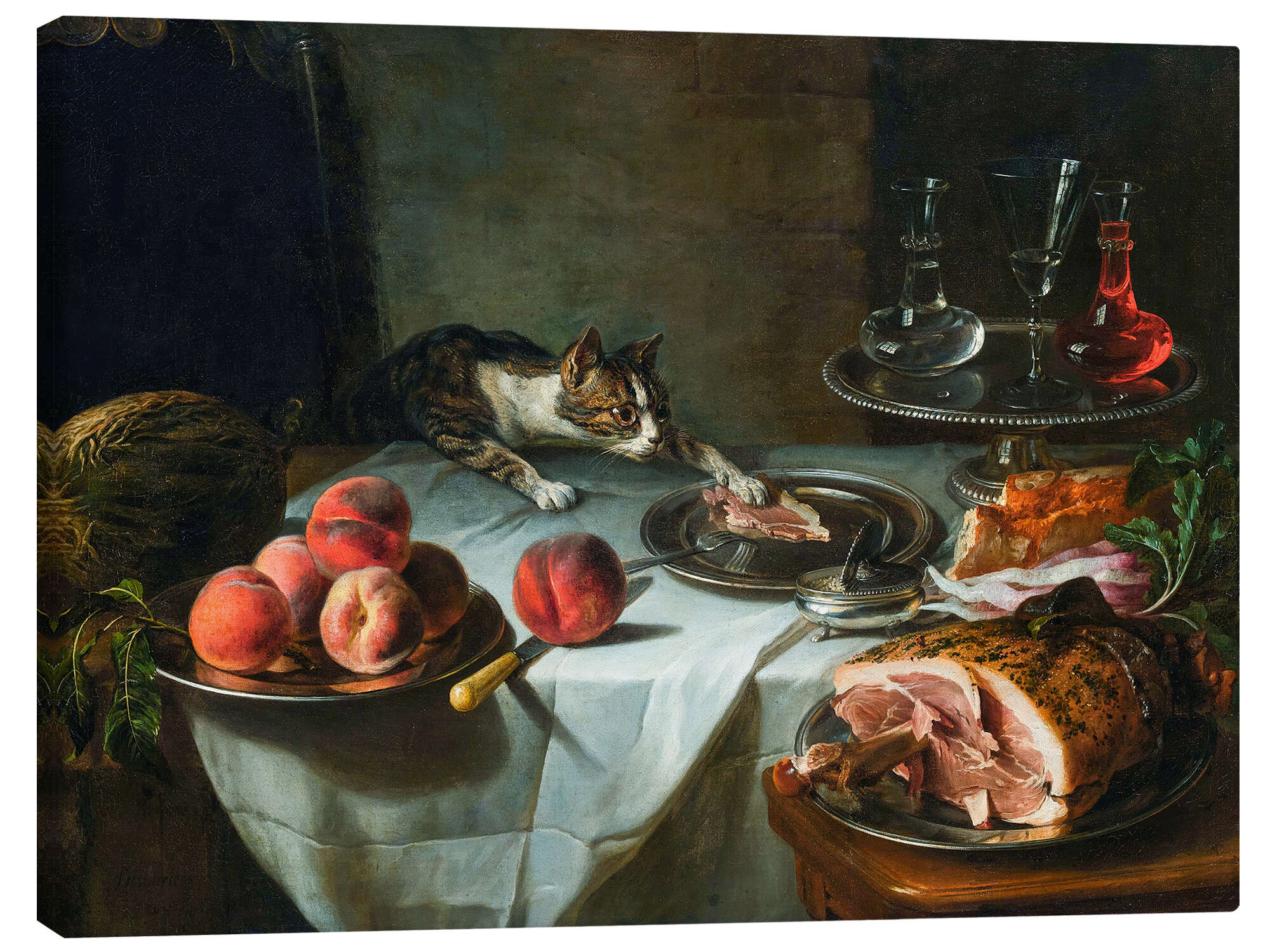 Leinwandbild Stillleben mit den Resten einer Mahlzeit und Katze