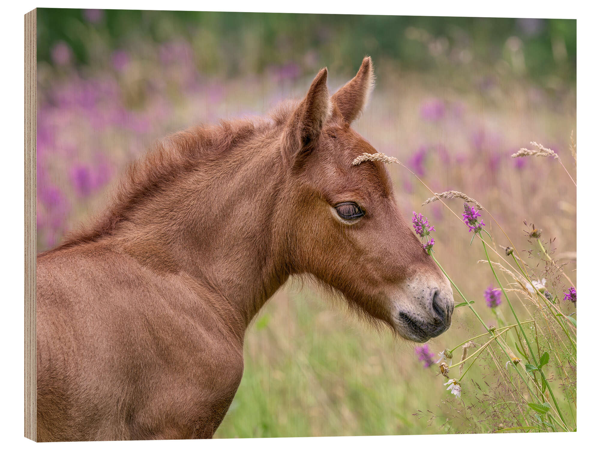 Posterlounge   Wandbilder   Fotografie   Katho Menden   Holzbild Islandpony Fohlen in einer Blumenwiese