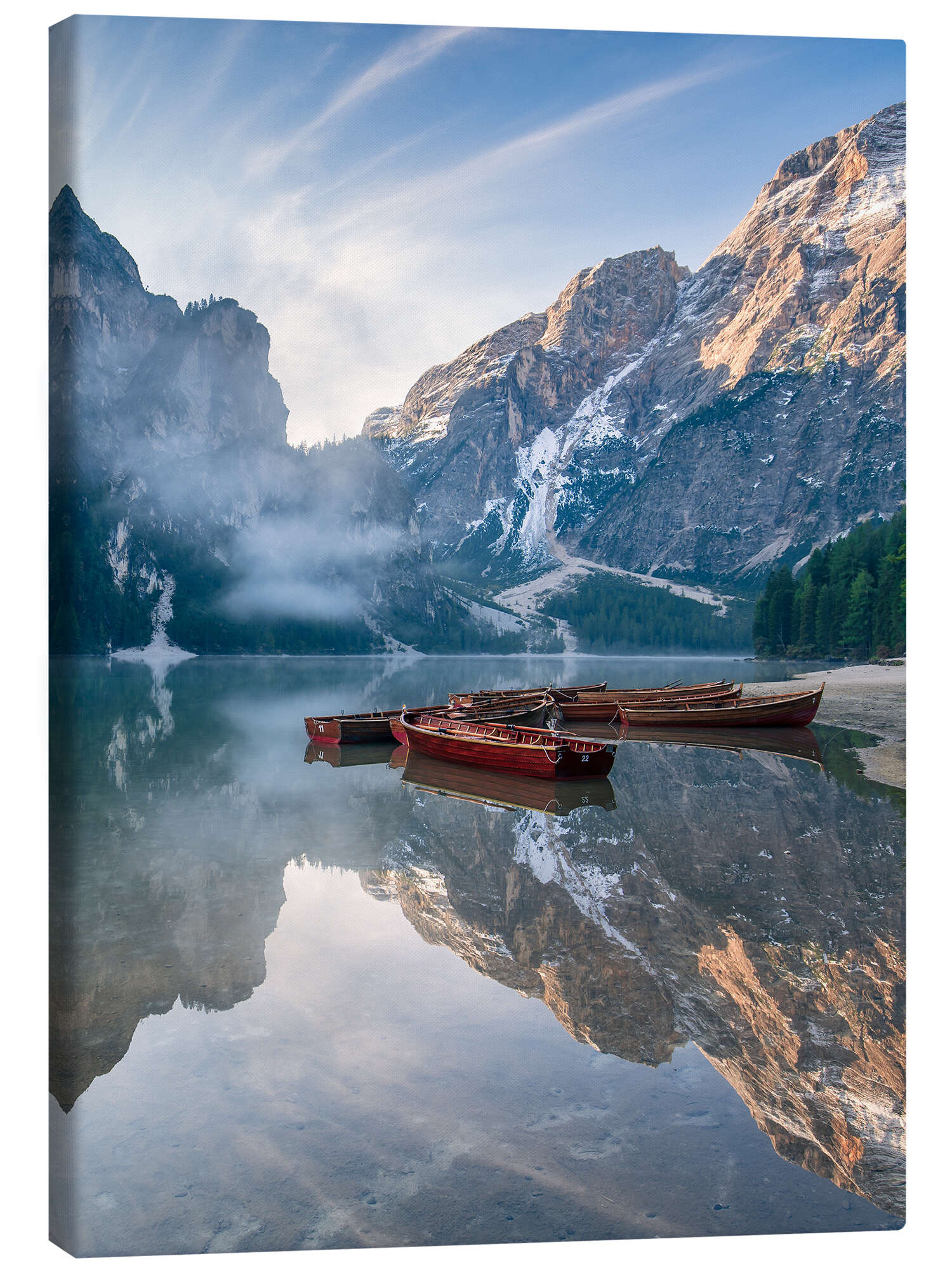 Posterlounge   Wandbilder   Blau   Achim Thomae   Leinwandbild Stille - Morgens am Pragser Wildsee Südtirol